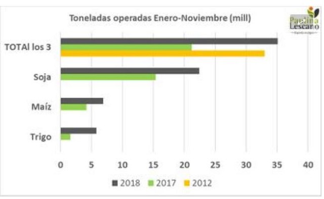El siguiente cuadro resume las toneladas (en millones) operadas para los tres principales productos agropecuarios en el Matba. Desde enero al 23 de noviembre de cada año analizado.