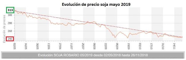 Desde mayo 2018 hasta ahora, el futuro mayo 2019 en el MATBA alcanzó máximos de U$S 313/TN y mínimos de U$S 242/TN, significa que, a seis meses de la futura cosecha, el valor de la mercadería que aún no termina de sembrarse, se desplazó U$S 70/TN desde los máximos a los mínimos.