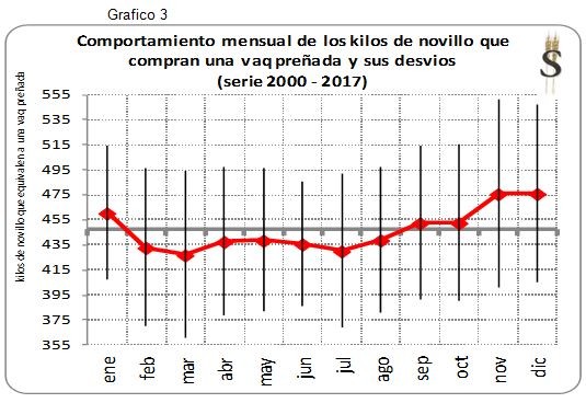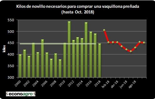 El promedio de la serie indica que 447 kilos de novillo equivalen a una vaquillona preñada. El máximo valor promedio anual relativo para los vientres, se obtuvo durante 2011 en donde fueron necesarios 543 kilos de novillo por vaquillona, mientras que el menor valor ocurrió en 2009 en dónde 378 kilos eran equivalentes a una vaquillona.