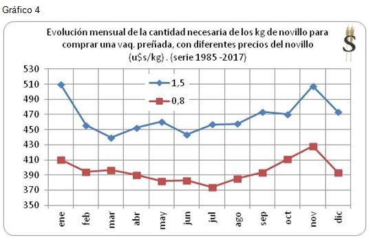 Cuanto mayor es el valor del gordo, más variabilidad existe en la relación entre las dos categorías. Incluso se modifica el momento de que se produce la relación menos favorable para el vientre. Cuando el precio del novillo es de 1 u$s/kg, el mínimo sucede en el mes de junio, mientras que si el precio del novillo fuera de 1,5 u$s/kg el mes en él que ocurre es marzo.