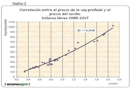 Este comportamiento histórico del precio del animal de cría respecto del novillo, tiene una correlación de casi un 97%.
