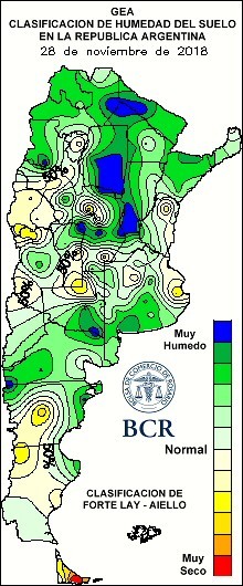 Se lleva cosechado un 55% del área cultivada. La gama de resultados es sumamente amplia, va de los 5 a más de 50 qq/ha. De la autopista Rosario-Córdoba hacia el norte de la región núcleo están los mayores problemas. Allí, al efecto de la helada del 2 de octubre, que tomó a los cuadros trigueros sin agua y muy estresados, ahora se le suma el efecto de las lluvias records de noviembre. Hacia Marcos Juárez recrudece el efecto de las heladas, los promedios están entre 15 y 17 qq/ha, cuando suelen superar los 38 qq/ha. Hacia Pellegrini o Cañada Rosquín se profundiza el efecto de las lluvias: los promedios están en los 23 qq/ha. Hay granos verdosos y se empieza a notar desgrane ante la imposibilidad de ingresar a los lotes por falta de piso. De lo que resta cosechar allí, el 70% se lo clasifica en malas condiciones. Hacia el sur de la autopista las cosas cambian, los rindes suben y los primeros lotes que se están cosechando en estos días insinúan un bono de 3 a 7 quintales más de lo que se esperaba. Habrá que esperar para ver si se sostiene este extra.