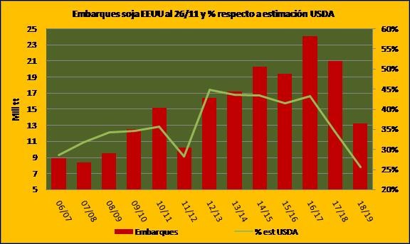 Para dimensionar lo anterior, en lo que va de la campaña 18/19 en EEUU (ha comenzado el 1/9) los compromisos de exportación de poroto hacia el primer importador mundial han alcanzado un insignificante volumen de 600 mil tt (barras y eje izquierdo del gráfico 1), muy por debajo del rango de 19-26 mill tt que se han registrado a esta altura en las últimas 5 temporadas.