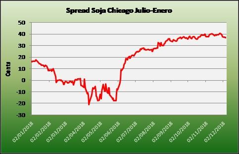 En este contexto, no sorprende que la demanda en el mercado de mayor liquidez mundial se muestre muy tranquila, y esto queda reflejado en un creciente carry entre las posiciones enero y julio. Este diferencial se ubica por encima de 36 cents (U$S 13.5 aproximadamente, tasa anualizada mayor al 8%) y deja en evidencia el premio significativo en esa plaza para no vender en corto plazo y en su lugar hacerlo en forma diferida a 6 meses.