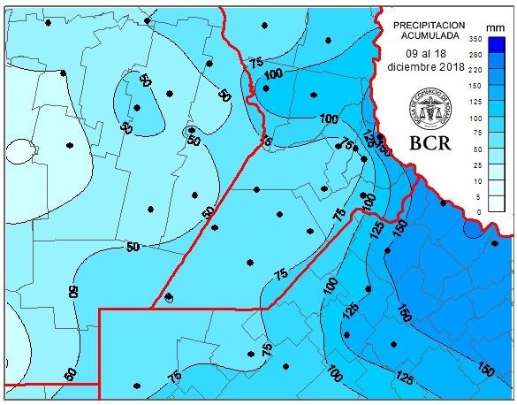 Del 9 al 18 de diciembre, en Entre Ríos hay marcas por encima de los 200 mm cómo en Gualeguaychú con 288 mm o en Federal o Concepción del Uruguay con 240 mm. En Buenos Aires, San Pedro alcanzó los 243 mm. Le siguen Ramallo y Baradero con marcas de más de 170 mm, Pergamino con 155 mm y Chacabuco con 140 mm. Hay otra zona que se destaca en el NO bonaerense, un poco más acotada, con lluvias que van de los 100 a 130 mm.