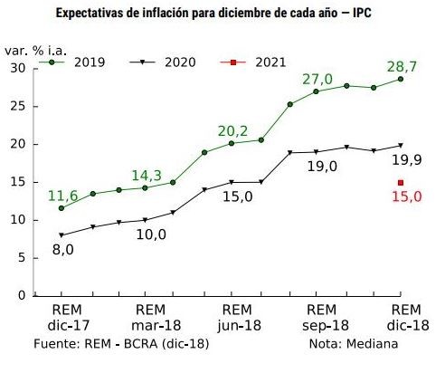 En el grafico pueden observas los pronósticos de las principales consultoras de mercado en distintas fechas, ninguna pudo predecir correctamente los niveles de inflación esperado, nosotros tampoco, sin embargo, seguimos pronosticando. La inflación esperada para el año 2019 se ubicaría en el 28,7% anual, para poder cumplir con este pronóstico, el peso durante el año 2019 no debería devaluarse más que dicho porcentaje.