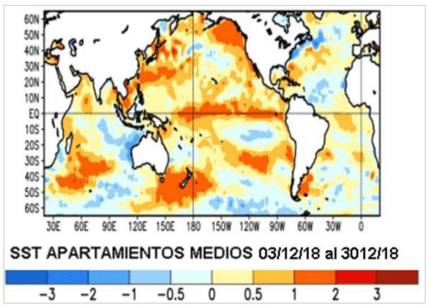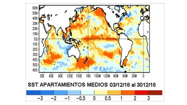 Las temperaturas del Pacífico Ecuatorial central durante el mes de diciembre se han mantenido con desvíos positivos durante casi todo el mes de diciembre, cediendo levemente hacia el final, pero sin dejar de configurar un calentamiento, débil, pero que sostiene el escenario Niño. En el mapa que promedia los apartamientos térmicos de las temperaturas superficiales del mar durante el mes de diciembre, se nota todo el corredor ecuatorial tomado por aguas cálidas. De acuerdo a lo previsto por los modelos, este comportamiento térmico puede presentar oscilaciones en su configuración espacial, pero a gran escala las variantes serán poco significativas durante el resto del verano y el comienzo del otoño. Es decir, la campaña estará sesgada por la presencia de este calentamiento ecuatorial, con influencia sobre el clima a escala planetaria y que resulta en general positivo para el desarrollo de las cosechas de granos gruesos en el sudeste de Sudamérica.