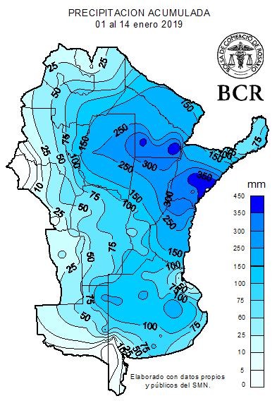 En lo que refiere a estos primeros 14 días del 2019, el este de Santiago del Estero, norte y oeste de Santa Fe, junto al norte entrerriano y gran parte de Corrientes superaron los 250 mm. En este período Reconquista (Santa Fe) acumuló 292 mm, La Paz (Entre Ríos) 310 mm. Pero hay zonas con más de 400 mm, cómo en Paso de los Libres (Corrientes) con 468 mm, Resistencia (Chaco) con 424 mm, o Mercedes (Corrientes) con 407 mm.