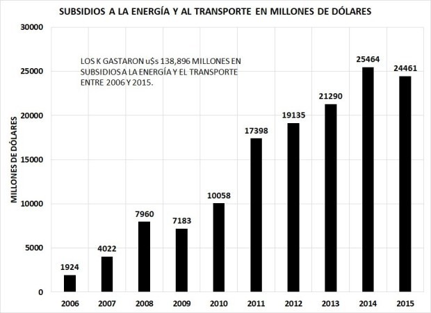 Entre 2006 y 2015 se destinaron U$S 138.896 millones a financiar tarifas “baratas” de energía y transporte, el 86% de los recursos destinados a financiar subsidios económicos se concentró en esos dos rubros. El kirchnerismo llegó a destinar 5 puntos del PBI a este revoleo de recursos para ganar votos.