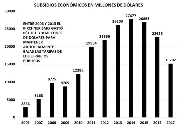 Si Cambiemos hubiese mostrado este simple gráfico en que se ve que entre 2006, cuando empiezan a darse subsidios para las tarifas de servicios públicos (subsidios que han dado lugar a casos de corrupción que hoy se investigan) y 2015, el kirchnerismo revoleó U$S 161.318 millones, la gente podría haber entendido la gravedad de la herencia recibida y del sacrificio que le esperaba para poder tener nuevamente energía, gas, transporte, etc. en calidad razonable.