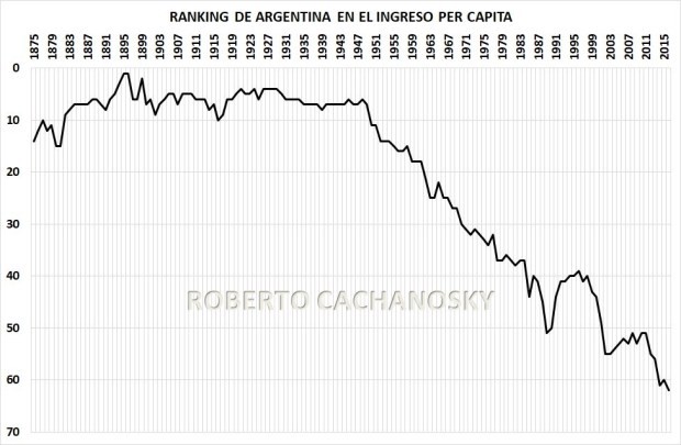 Aun agregando más países, queda marcado el punto de caída a mediados de la década del 40. Como con las estadísticas uno puede inventar los datos que quiere, tomo una tercera opción que es la de Nicolás Cachanosky, quien calculó en qué posición se ubicaba Argentina entre los países de mayor ingreso. El gráfico 3 muestra que hasta la década del 70 Argentina perteneció al 20% de los países de mayor ingreso per capita, pero se ve claramente que la tendencia a la baja se da a partir de 1947. Es decir, cualquiera sea el mecanismo que se elija para ver en qué momento dejamos de ser un país que crecía, ofrecía condiciones para invertir y creaba puestos de trabajo, todos llevan a mediados de la década de 1940.