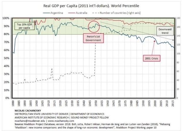 Algunos podrán argumentar que esa constitución fue escrita para el siglo XIX y hoy las cosas son diferentes. La realidad es que cuando imperaron los valores de la Constitución de 1853 estábamos entre los 10 países con mayor ingreso per capita y llegamos a ser primeros. Cuando llegaron las ideas modernas de la economía cerrada, la redistribución del ingreso, las empresas estatales, los impuestos progresivos, el Banco Central y la cultura de la dádiva de los políticos “buenos” que hacen caridad con la plata del contribuyente, pasamos a estar en el puesto 62 en el ranking de los países de ingreso per capita y con tendencia a seguir bajando. Justamente, para desprestigiar las ideas de la Constitución de 1853, los progres y los populistas tienen que desprestigiar a la generación del 80 o dejar de enseñar cómo se construyó Argentina luego de Caseros. El revisionismo histórico apuntó a destruir los valores que hicieron grande a la Argentina. A demonizar a la generación del 80.