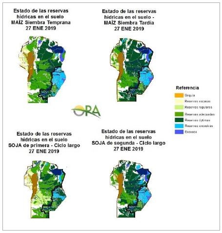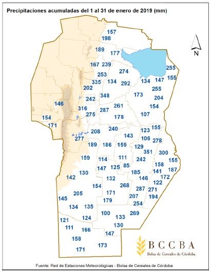 La mayoría de los departamentos de la provincia han registrado precipitaciones que superan tanto al Enero de 2018 como al correspondiente histórico (2007-2019). Hacia la segunda quincena del mes, se dieron precipitaciones de variada intencidad, lo que contribuyó a que el estado de las reservas hídricas en suelo se muestra de adecuadas a óptimas en casi todo el territorio provincial, a excepción de zonas de los departamentos de Unión, Marcos Juárez, General San Martín, Tercero Arriba, Juárez Celman y Pte. Roque Sáenz Peña, donde hay reservas excesivas y excesos hídricos según la Oficina de Riesgo Agropecuario (ORA).