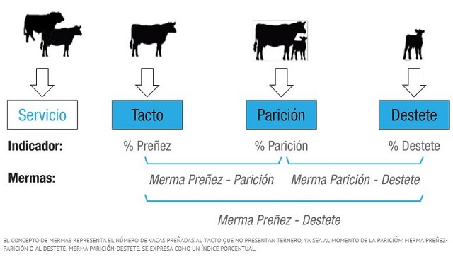 El concepto de mermas representa el número de vacas preñadas al tacto que no presentan ternero, ya sea al momento de la parición: merma preñez-parición o al destete: merma parición-destete. Se expresa como un índice porcentual.