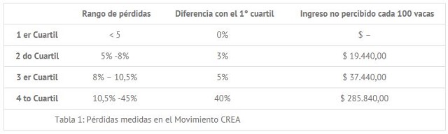 Considerando las mermas relevadas dentro del movimiento CREA, se realizó la estimación de los ingresos no percibidos por venta de terneros no logrados a causa de las mermas preñez-destete. Para ello, se tomó como referencia al rango de pérdidas correspondiente al cuartil superior y se estimó la diferencia de pérdidas de cada rango respecto al cuartil superior (Tabla 1). Las pérdidas se calcularon tomando como referencia un rodeo de 100 vacas preñadas. Con un valor de $7.200 por ternero de 160 kg/cab, si las mermas se encuentran dentro del segundo cuartil, los ingresos no percibidos son de $19.440. Para el tercer y cuarto cuartil, las mermas significan $37.440 y $285.840, respectivamente.