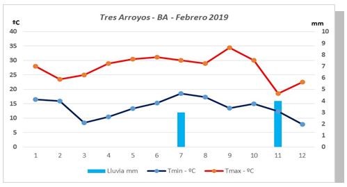 A modo de referencia de escala local vamos a analizar la ciudad de Tres Arroyos – Buenos Aires. En el mes de Enero el registro de lluvias ascendió a 140.1 mm pero lamentablemente casi el total de este valor se alcanzó en tan solo dos jornadas, la primera el 12/01 y la restante el 24/01. Por otro lado en lo que vamos transitando del mes de Febrero, el registro total alcanza apenas los 7 mm. En el siguiente gráfico mostramos la marcha de las temperaturas Mínimas y Máximas y los acumulados de lluvias para los primeros días del mes de Febrero.