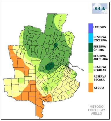 Si nos extendemos nuestra observación a escala regional, todos los partidos entran en un contexto desfavorable en cuanto a los acumulados. Cnel. Dorrego, Cnel Pinglés, A. G. Chávez, Puán. Saavedra, Tornquist, Laprida, Bahía Blanca, son algunos de los partidos más representativos donde por ejemplo este último solo acumuló 15.2 mm en enero y alcanza apenas los 3 mm en la primera quincena de Febrero. En términos de distribución de humedad, simulando sobre el suelo una pradera permanente el siguiente mapa presenta la reserva de agua útil para las seis provincias pampeanas al 11 de Febrero de 2019.