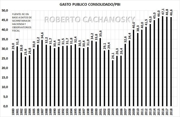 Pero esa maraña de impuestos se explica por el fenomenal aumento del gasto público consolidado a partir de la llegada del kirchnerismo al gobierno en 2003.