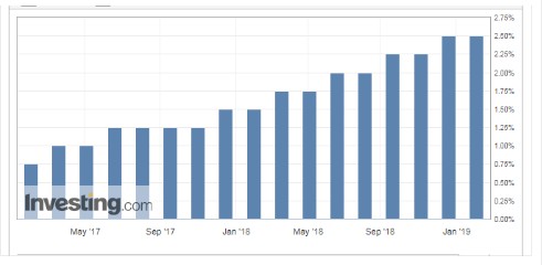 Acá vemos el gráfico de los últimos años de la tasa de interés de la Reserva Federal de EE.UU.