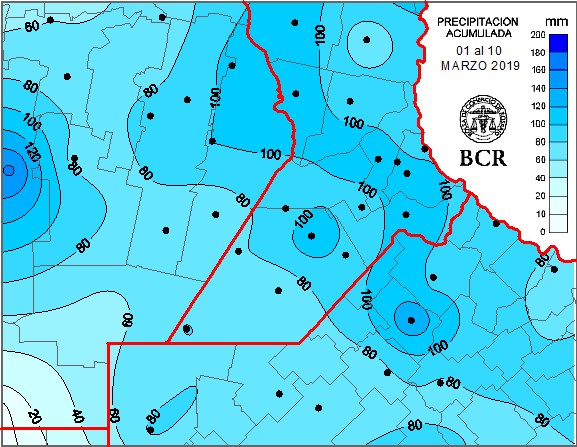 Para el resto de la región, la amenaza de grandes lluvias quedó contenida. El paso del frente fue más veloz que lo que se presumía y el oeste quedó fuera del paso de los mayores montos. De todas formas la región núcleo ha recibido en los primeros 10 días del mes unos 90 mm en promedio, el 75% de la carga hídrica que propone la estadística pluvial de marzo. Las lluvias del viernes 8 de marzo se concentraron sobre el NE boanerense y el SE santafesino con lluvias de 30 a 50 mm.