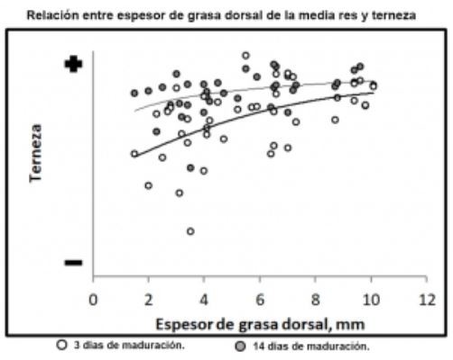 Con la maduración de tres días también se advirtió que a menor espesor de grasa dorsal la carne no solo fue más dura, sino que los datos fueron más variables. “Si la media res alcanza los 6 a 8mm de cobertura, además de mejorar la terneza, ésta será más consistente, un aspecto clave para la decisión de volver a comprar un corte. Además, se logra sin necesidad de prolongar la maduración, que significa un costo importante para la industria”, argumentó. Y advirtió que “por arriba de ese espesor no se alcanzaría un beneficio extra, además de representar un sobrecosto para el productor”.