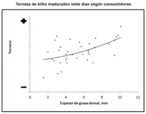 El efecto positivo del espesor de grasa dorsal sobre la terneza se confirmó con paneles de consumidores, conformados por 80 personas no entrenadas. Se evaluaron bifes provenientes de los mismos animales a los que se midió por resistencia al corte y los resultados se volcaron en un gráfico.