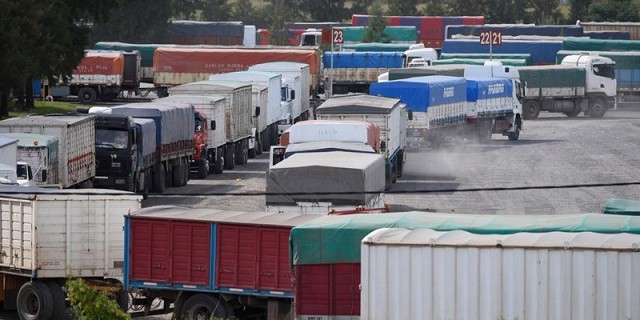 llega con la larga fila de camiones que esperan para descargar, en momentos en