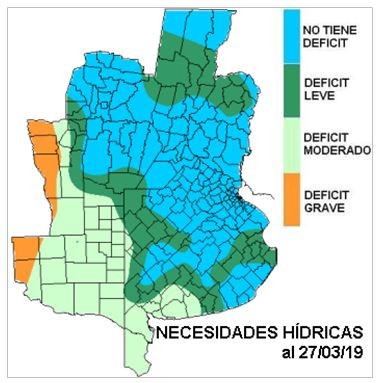 El mapa resume la vasta zona donde a la fecha las necesidades hídricas son nulas. Si a ella le sumamos el sector donde el déficit es leve, casi la totalidad del área agrícola de la región pampeana no demanda precipitaciones. Hacia el sudoeste de BA, sobre LP, el extremo sudoeste de CB y la mayor parte de SL son las zonas que plantean lo contrario y que por el momento no recibirán ningún auxilio significativo.