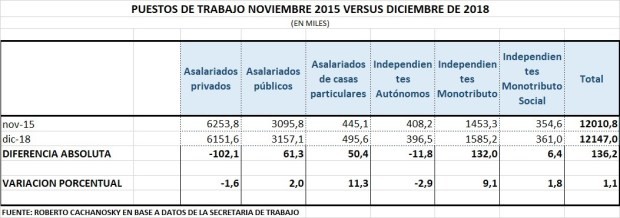 Es más, si uno observa la evolución del empleo desde noviembre 2015, último mes completo del kirchnerismo y diciembre de 2018, puede ver que el empleo público creció en estos años y el empleo privado se redujo.