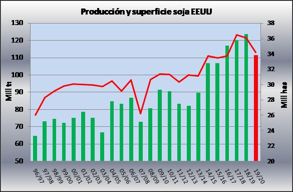 En base a estos números, y considerando rindes de tendencia de 33 qq/ha y una proporción de cosecha de prácticamente 99%, la producción de EEUU en la campaña 19/20 alcanzaría niveles ligeramente superiores a 111 mill tt (tal como se aprecia en el gráfico 3). En la evolución interanual esto supone una contracción de aproximadamente 12 mill tt.