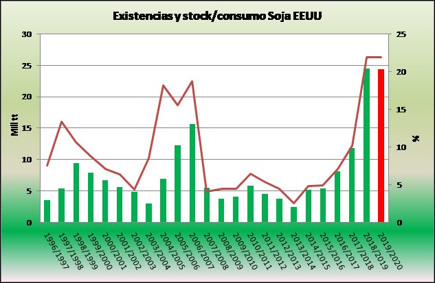 Suponiendo que la demanda en EEUU para el próximo año comercial no muestre alteraciones respecto al último informe de USDA, entonces los inventarios finales de EEUU para el ciclo 19/20 serían similares a los del ciclo en curso (24.4 mill tt; barras y eje izquierdo del gráfico 4), en tanto que la relación stock/consumo seguiría en torno al 22% (línea y eje derecho, continuaríamos en máximos históricos)