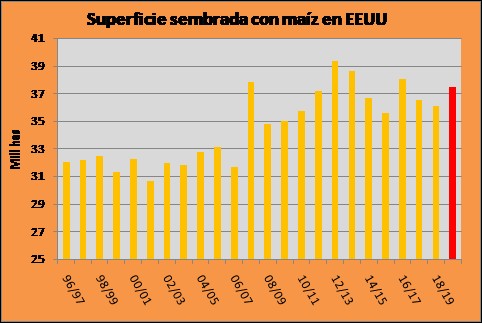 El reporte de intención de siembra en EEUU informado por el USDA ha resultado menor a las estimaciones en 700 mil has. Esto debe ser considerado como positivo para cosecha nueva de este cultivo, en un contexto en el que la transición hacia la temporada 19/20 se hará sin problemas dado los abultados stocks.