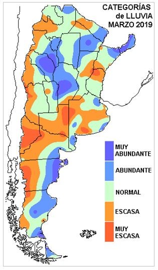 En el resumen pluvial del mes de marzo, aparece una importante alternancia de zonas con distinta oferta de agua. La provincia de LP, el sudeste de CB, las vecindades de SF y el noroeste de BA, definen la zona que quedó más atrasada en el volumen de lluvias. Este sector se extendí en forma irregular hacia el este y hacia el sur. Por otro lado, las últimas jornadas del mes de marzo, sumaron precipitaciones muy significativas desde Tucumán hasta el centro de CB, sobrepasando de manera notoria los valores estadísticos en este corredor. Lo mismo ha sucedido en áreas del NEA y el norte de la Mesopotamia. En términos relativos estos desvíos son importantes también en la costa patagónica, aunque no de mucha importancia en el volumen total.