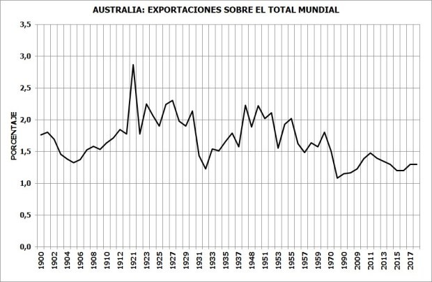 A modo de ejemplo podemos ver el caso de Australia que actualmente exporta el 1,3% de las exportaciones mundiales y en el pasado tuvo una participación entre el 1,5 y el 2 por ciento en promedio. Con Canadá ocurre algo parecido, a principios del siglo XX exportaba el 2,5% del total mundial y actualmente tiene el mismo nivel.