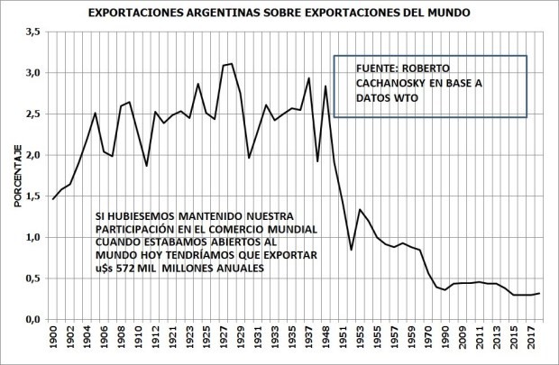 El dato no es menor, porque si hubiésemos mantenido la participación en el comercio mundial como es el caso de otros países, por ejemplo Canadá o Australia, decía, si hubiésemos mantenido nuestra participación en el comercio mundial actualmente tendríamos que estar exportando U$S 572.000 millones, es decir, deberíamos estar exportando U$S 510.000 millones más por año de lo que exportamos. ¿Cuántos puestos de trabajo, riqueza y nivel de vida se perdieron por exportar U$S 510.000 millones menos de los que exportamos?