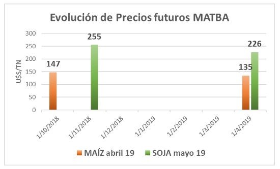 Veamos cómo evolucionaron los precios de cosecha 18/19 MATBA, maíz abril y soja mayo, desde la fecha de siembra hasta ahora: