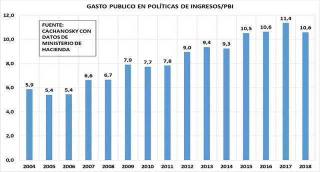El gráfico 3 muestra que el gasto en políticas de ingresos (AUH, pensiones no contributivas, políticas de empleo del Ministerio de Trabajo, etc.) aumentó en casi 5 puntos del PBI entre 2004 y 2018, el gráfico muestra que Cambiemos no bajó el gasto en este rubro, y sin embargo hay más pobres. No podemos medir toda la serie porque el kirchnerismo desarmó la serie del INDEC para no “estigmatizar” a los pobres, pero de acuerdo a datos de la UCA, el kirchnerismo dejó una pobreza del 29% y el último dato del INDEC dio 32%, es decir, a pesar que se mantuvo los programas de políticas de ingresos, la pobreza no cede. Y no cede porque el sector privado sigue siendo aplastado por el sector público nacional, provincial y municipal con su enorme burocracia, empleo público y “planes sociales”. Argentina no crece porque no hay inversiones en un país con una carga tributaria que se mantiene entre las más altas del mundo.