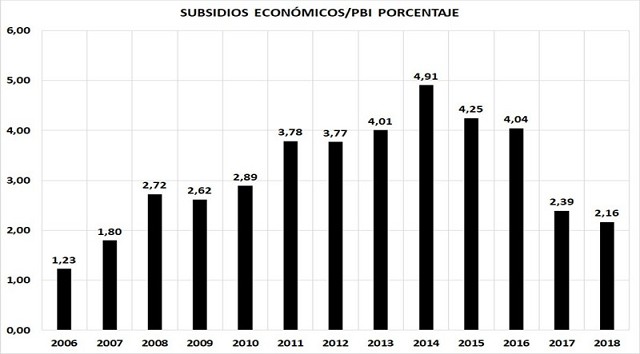 Para responder al interrogante, basta con ver el gráfico 2. El gasto en subsidios económicos para mantener artificialmente bajas las tarifas de los servicios públicos (energía, transporte público, gas, agua potable, etc.) bajó de 4,25% que dejó el kirchnerismo a 2,16% del PBI con Cambiemos. Es decir, de los 2,8 puntos que bajó el gasto público en la era Cambiemos, 2,1 puntos porcentuales se explica por menores subsidios económicos, es decir aumento de tarifas de los servicios públicos.