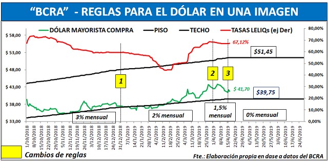 Pero vamos a los hechos. Durante la semana que terminó el señor Presidente del Banco Central, Guido Sandleris, modificó por tercera vez desde el 1 de octubre de 2018 las “Reglas del Juego Cambiario” que él mismo estableció en aquella fecha. Aquel día impuso un “Rango de Libre Flotación” entre $34 de Piso y $44 de Techo; dentro del cual el Valor del billete verde quedaría expuesto al libre juego de la Oferta y la Demanda; aunque lógicamente dependiendo también de la Madre de las Herramientas que es la Tasa de Interés. Dicho rango se actualizaría (subiría) diariamente, según lo descripto en aquel momento, a un ritmo del 3% mensual. Pues bien, 2 meses más tarde y luego de que el Relevamiento de Expectativas de Mercado del 4/12/18 reportara una Inflación esperada a 12 meses a la baja, resolvió modificar aquel 3% y actualizar el rango desde el 01/01/19 al 2% mensual. Tres meses después, hacia fin de marzo, luego de algunas subas importantes del valor de la divisa durante el mes y buscando anclar expectativas, decidieron cambiar nuevamente y actualizar el rango al 1,5% mensual desde el 1/04. Y finalmente el 15 de Abril, lunes de la semana pasada, decidieron que el Rango quedará fijo en valores de $39,75 (Piso)-$51.45(Techo) hasta fin de 2019, y aclararon también que el BCRA NO COMPRARÁ DÓLARES PARA HACERLO SUBIR SI PERFORARA EL PISO DEL RANGO, AL MENOS HASTA FIN DE JUNIO. Con lo cual es un PISO que no es Piso, como tal NO EXISTE. En este sentido es importante tener presente que los Derecho de Exportación impuestos el 3 de septiembre pasado de $4/dólar para Granos y $3/dólar para Harina y Aceites implican mayor % a medida que cae el precio del Billete verde. Este nueva y triste historia de Cambios de Reglas de Juego se detalla en el gráfico que sigue., entre el 1 de octubre de 2018 y el 17 de abril de 2019.