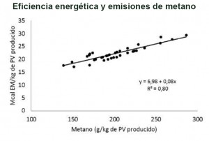 De acuerdo con lo esperado, los modelos que lograron mayor ganancia diaria durante toda la recría fueron los más eficientes dado que requirieron menor cantidad de Energía Metabolizable consumida por kilo producido. Hubo una relación lineal entre la energía demandada para producir un kilo de ganancia y la cantidad de metano emitido por unidad de producto. Esto significa que a mayor eficiencia energética, es decir menor relación McalEM/kg PV producido, menor fue la intensidad de emisión de metano.