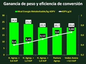 – Pastoreo de verdeo de avena + suplementación al 0,5% PV con grano de avena durante otoño-invierno y pastoreo de agropiro en primavera.