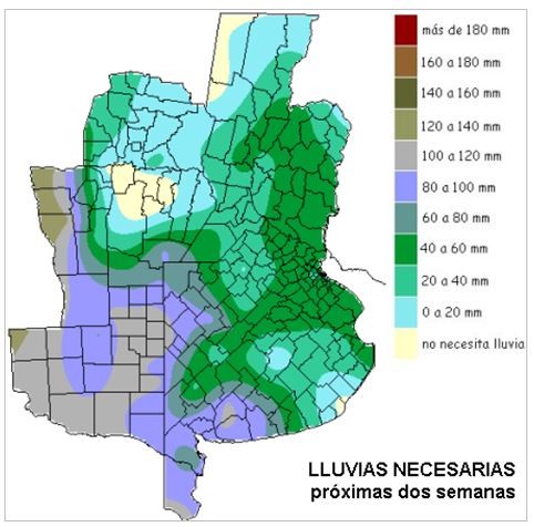 Como mencionamos al comienzo, las inundaciones del Chaco contrastan con la alta demanda de lluvias que presenta el oeste bonaerense, gran parte de LP y zonas del sur de CB. Este sector paradójicamente puede tener zonas con napas altas, pero de cara al inicio de la fina, es necesario que se concreten recargas superficiales.