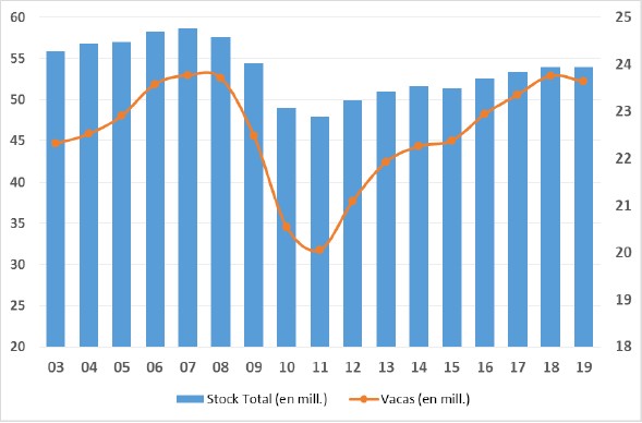 Mientras que en la categoría vacas, si bien hay una leve disminución del 0,54% (-127.988) respecto 2018, era un resultado esperable al considerar que desde el año 2011 se viene recuperando el stock, principalmente a través de esta categoría. Cabe recordar que ya para el 2018 se habían recuperado en un 100% las vacas del pico histórico de nuestro stock del 2007, previo a la liquidación.