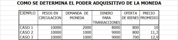 Ahora bien, si vamos al caso 2 suponemos que, por cualquier razón, las expectativas de la gente son que los precios seguirán subiendo o el contexto político deteriorará más el poder adquisitivo de la moneda, por lo tanto, suponemos que la demanda de moneda baja de 2.000 a 1.000. En ese caso la cantidad de moneda que circula pasa a ser 9.000, es decir, aumenta el total de pesos que se usan para transacciones sin que el Banco Central haya emitido un solo peso. Si la oferta de bienes es de 800, el precio promedio aumenta a 11,3.