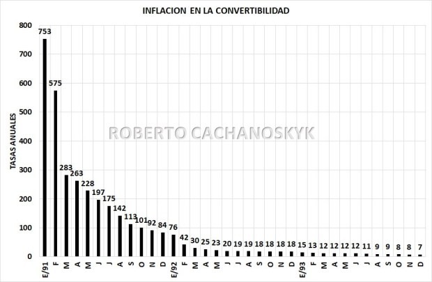 Si en 1991 con una regla monetaria muy potente que la gente comprendía como era el caso de la convertibilidad, y además había un plan económico sólido detrás de la regla monetaria, se tardó algo más de dos años para bajar la inflación a un dígito, es comprensible que con esta regla monetaria del gobierno de no aumentar la base monetaria y sin un plan económico detrás, continúe la huida del peso. Digo esto porque la gente no comprende qué es la base monetaria, por lo tanto no es tan convincente como la convertibilidad a la hora de generar expectativas positivas en el común de la gente acerca del peso. Si a la gente le dicen que hay un dólar respaldando cada peso que hay en circulación, la gente no huye del dinero. Si se le dice que no va a aumentar la base monetaria, el tema se complica porque, salvo los economistas, el común de la gente no tiene porqué saber qué es la base monetaria.