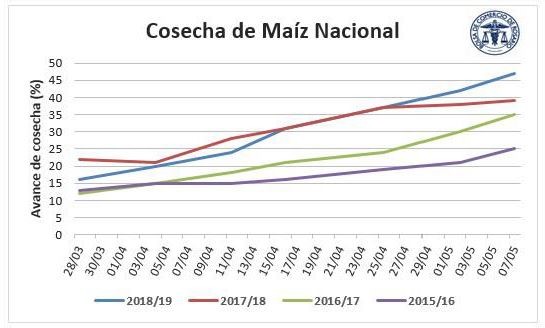 El buen tiempo en el centro y sur de la región pampeana ponen al avance de cosecha de este ciclo claramente por encima de las últimas 4 campañas. Aparte, con el 47% del maíz cosechado, los rindes que se observan son superadores de los valores estimados. Se nota un despegue, con mejores valores de productividad unitaria en las siembras tempranas. Tambien se prevé un excelente comportamiento de las siembras tardías. Se destacan las mejoras en Buenos Aires, La Pampa y Santa Fe. De todas maneras, seguirán haciéndose ajustes con el avance de las labores.