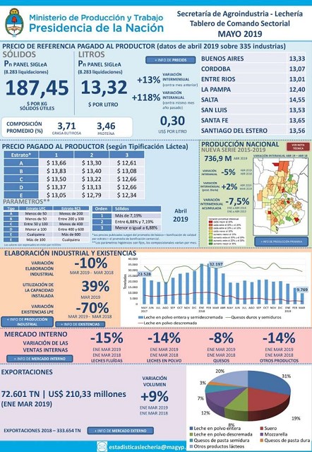 "El crecimiento de las exportaciones motoriza al resto de la cadena, porque la producción láctea argentina está fuertemente vinculada al mercado externo", destacó el titular de la cartera agroindustrial nacional, Luis Miguel Etchevehere, al señalar que "el precio de referencia pagado al productor por litro de leche alcanzó $13,32 en abril, lo que marca un alza del 13% en comparación con el mes anterior, y 118% respecto a abril de 2018".