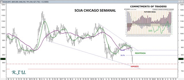 En este sentido, queremos compartir con el lector la siguiente gráfica continua del precio de la soja Chicago, que por un lado nos muestra la secuencia de caída que viene desarrollando el commodity en los últimos años, en este caso desde los máximos del año 2016, bajo la formación de triángulo diagonal o cuña, y que por otro lado nos advierte por medio del índice COT (Commitments of Traders) el alto nivel de exposición vendida que trae el segmento especulativo en estas instancias.