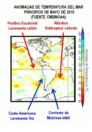 Por su parte, el Océano Atlántico muestra fuertes perturbaciones: Su porción subtropical observa un marcado calentamiento, causado por el avance hacia el sur de la corriente cálida del Brasil, mientras que su porción meridional se encuentra levemente por debajo de su temperatura normal, hacia debido al avance hacia el norte de la corriente fría de Malvinas.