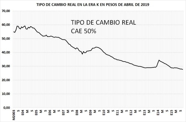 Duhalde devaluó un 40% y terminó buscando el tipo de cambio 4 a 1. Lo cierto es que luego de corralón, pesificación asimétrica y demás embrujos, Néstor Kirchner asume con un tipo de cambio de $ 55 actuales y Cristina Fernández entrega el gobierno con un tipo de cambio a pesos de abril 2019 en $ 28.